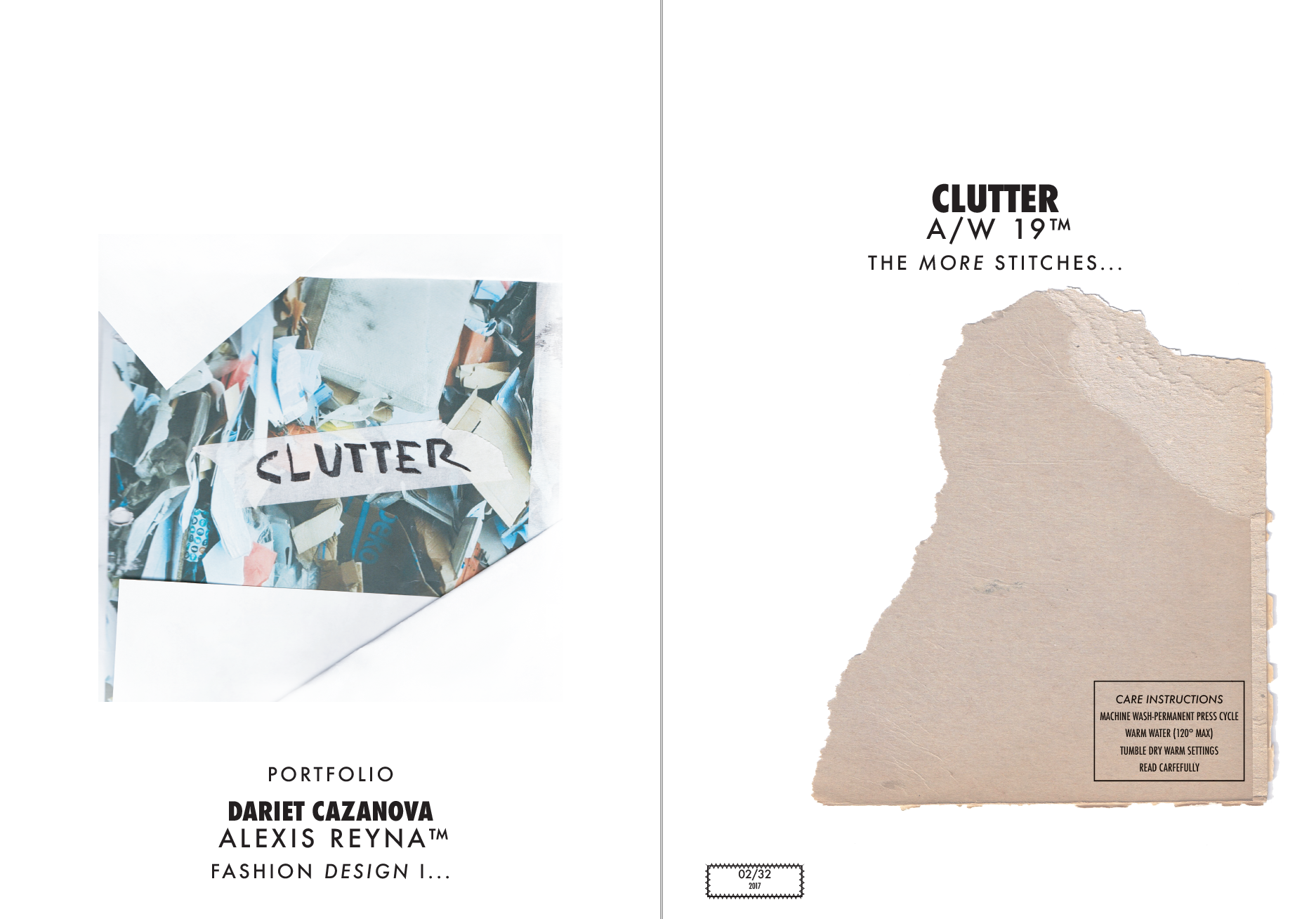 THIS GARMENT WAS MADE BY A HUMAN BEING WITH THE AID OF MACHINES AND IS WARRANTED TO MEET OR EXCEED THE STANDARDS OF MAKING A GARMENT. ENDING IS BETTER THAN MENDING, ENDING IS BETTER THAN MENDING, ENDING IS BETTER THAN MENDING, THE MORE STITCHES, THE LESS RICHES, THE MORE STITCHES, THE LESS RICHES, THE MORE STITCHES, THE LESS RICHES. CLUTTER IS AN A/W 19 COLLECTION (CONCEIVED IN 2017) OF VERSATILE GARMENTS THAT MAKE A WIDER RANGE OF POSSIBILITIES. THIS PROJECT FOCUSES ON THE ISSUES ENGAGING IN THE CONSUMER CENTERED WORLD WE LIVE, TAKING REFERENCE FROM THE COMPULSIVE HOARDING DISORDER AND ARTISTS WHOSE SUBJECT FOCUSES ON TODAY’S WASHED MINDED SOCIETY OR THE CONDITIONS IN WHICH ART IS MADE. MY WORK IS CONSISTENT IN HIGHLIGHTING MY PROCESS-ORIENTED METHOD, I BELIEVE THAT IN ORDER TO TRANSMIT MY IDEA I NEED TO NOT ONLY GUIDE THE WORK TO A MAIN THREAD, BUT DEVELOP THE MEANING IN THE WORK AS IT PROGRESSES. HOARDING REFERENCES AND IDEAS, LEANING TO LARGER AMBIGUITY AND AT THE SAME TIME A MORE WELL ROUNDED CONSISTENCY.
